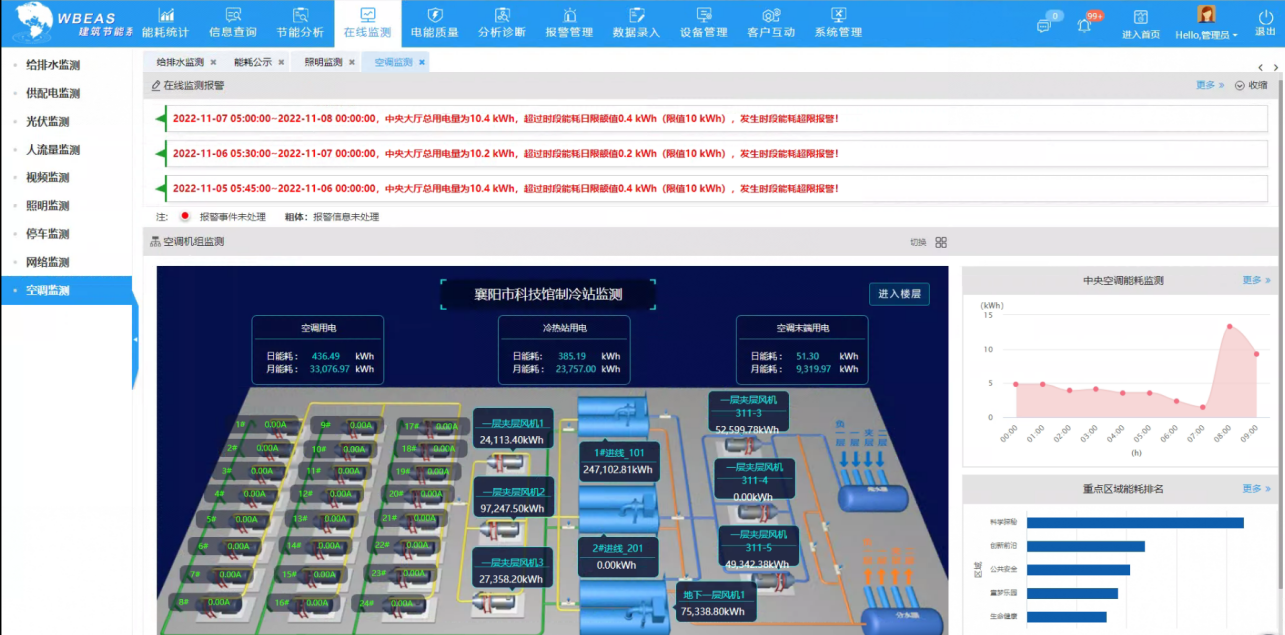 襄陽科技館能源監測點多,能源管網錯綜復雜,人工不能做到能源實時精準管控,跑冒滴漏較難被及時發現,系統上線運行后,通過實時數據以及強大的節能和分析診斷功能,除了滿足對能耗異常進行原因追溯外,還能對重要機電設備運行情況進行節能潛力挖掘,滿足建筑能源管理和機電運維精細化管理需要。