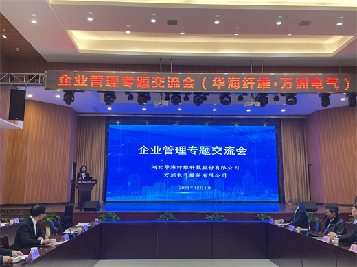 在一樓多功能會議廳,雙方開展企業管理專題交流討論。華海纖維作為萬洲電氣節能系統用戶,萬洲電氣襄陽研發中心總經理路寧首先匯報了華海纖維系統運行狀況以及進一步發揮系統價值情況。隨后,雙方重點圍繞“黨群建設、企業管理提質增效、新產品開發、綠色能源發展趨勢、市場營銷、人才儲備”等方面進行深入探討和交流。趙總分享了“萬洲電氣擁有一支團結勤勉的領導班子、萬洲的創新、培訓、企業文化”等發展壯大的法寶。周書記從華海纖維如何培養員工的歸屬感、凝聚力、榮譽感等方面介紹了獨特的管理方法,并分享了華海纖維依靠科技創新搶占新市場、合理布局戰略客戶、防范資金風險等管理經驗。交流中,雙方還就提升企業執行力、人才隊伍建設、企業上市路徑規劃等方面展開深入討論。