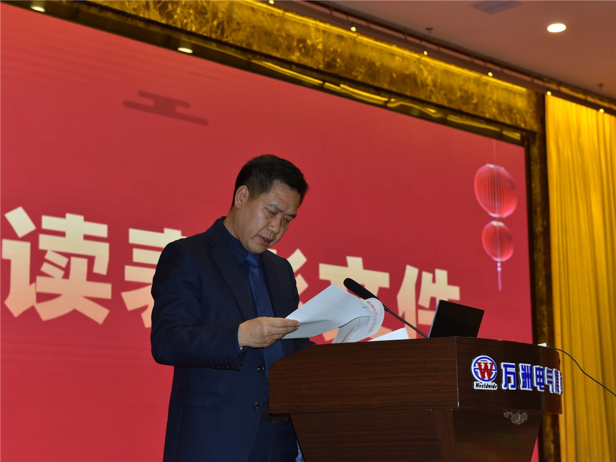 回首往昔、總結奮進李總首先宣讀了萬洲電氣先進個人、先進團隊、銷售獎勵等表彰文件,通報了2024年銷售員銷售業績和工資收入等,各類先進和年入百萬的銷冠贏得大家熱烈掌聲。隨后,邦總宣讀了萬洲機械、云川光電、萬州光電各類表彰文件。據統計,此次集中表彰,萬洲集團累計頒發經營管理、科技創新、市場開拓等先進獎項近兩百萬元。