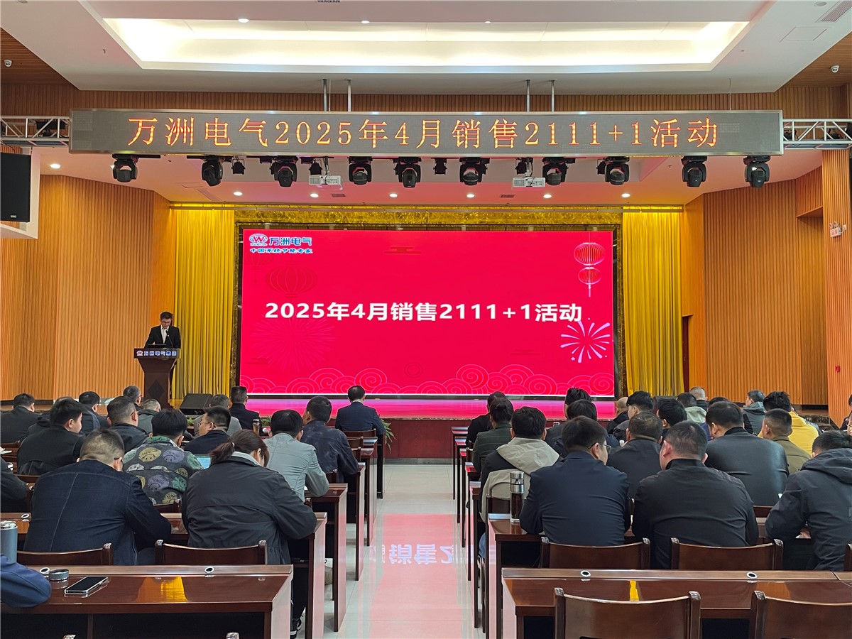 春啟華章,標桿領航。3月31日,萬洲電氣在1樓多功能廳開展4月銷售2111+1活動,總結一季度市場業績,獎勵銷售精英。萬洲電氣董事長、總經理趙世運、萬洲電氣副總經理李明輝出席會議。